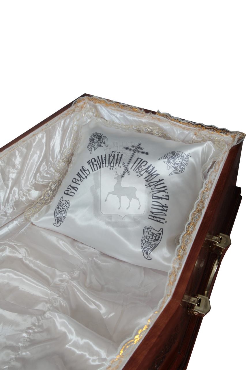 Под убранством в гроб обычно подразумевается комплект, состоящий из подушки для головы и савана. Иногда к этому набору добавляются тканевые тапочки. Этот комплект может входить в комплект гроба, но нужно уточнять детали при заказе.